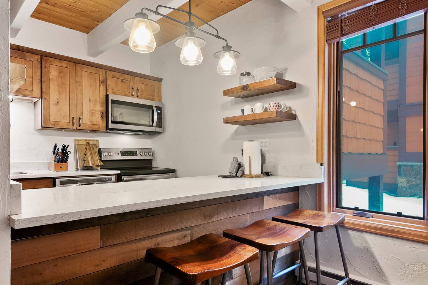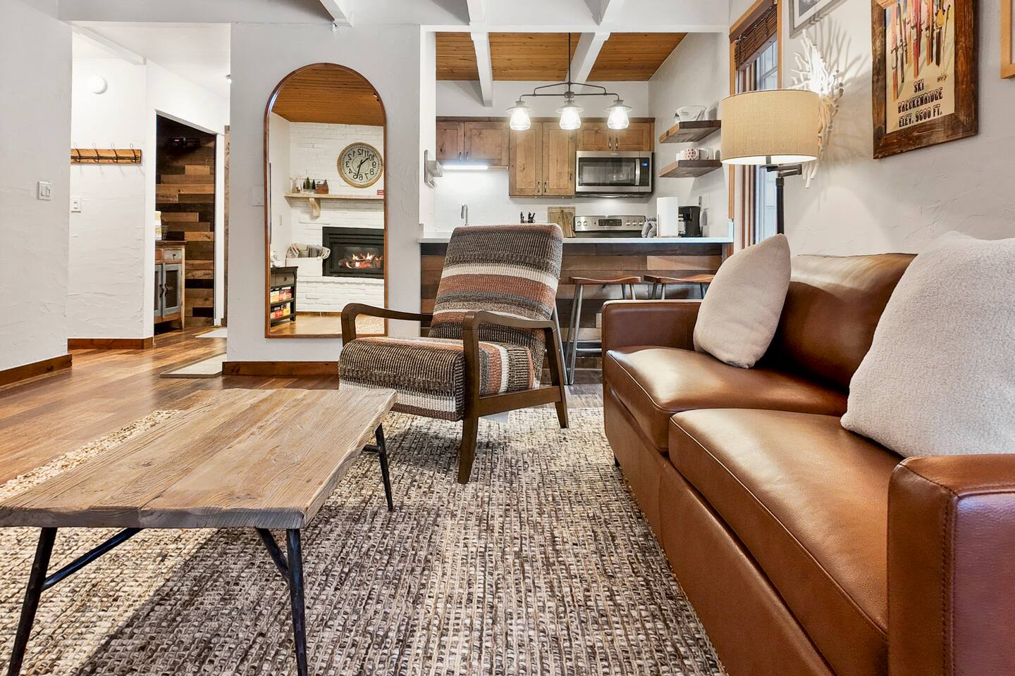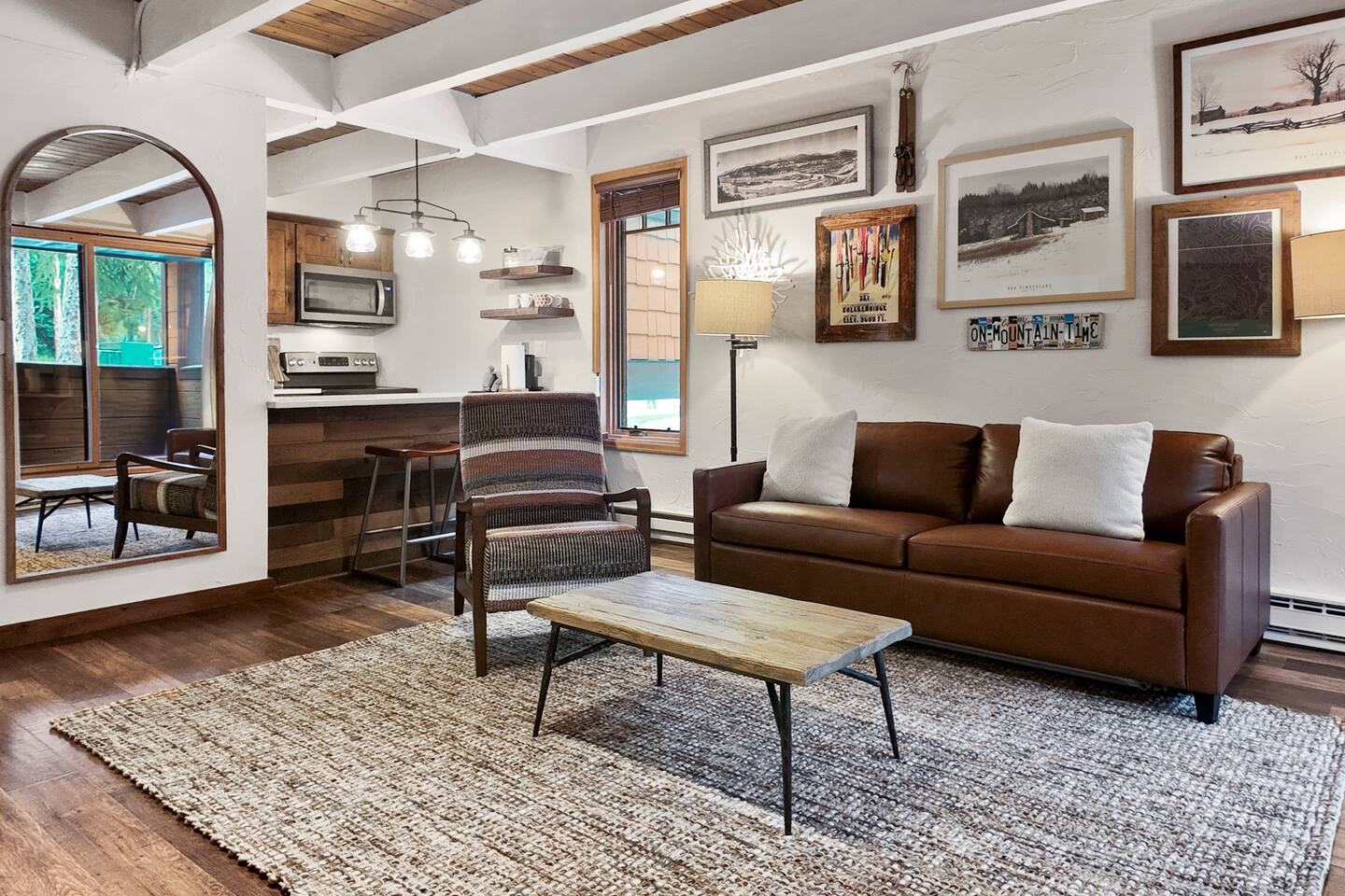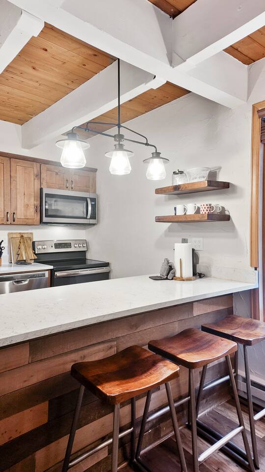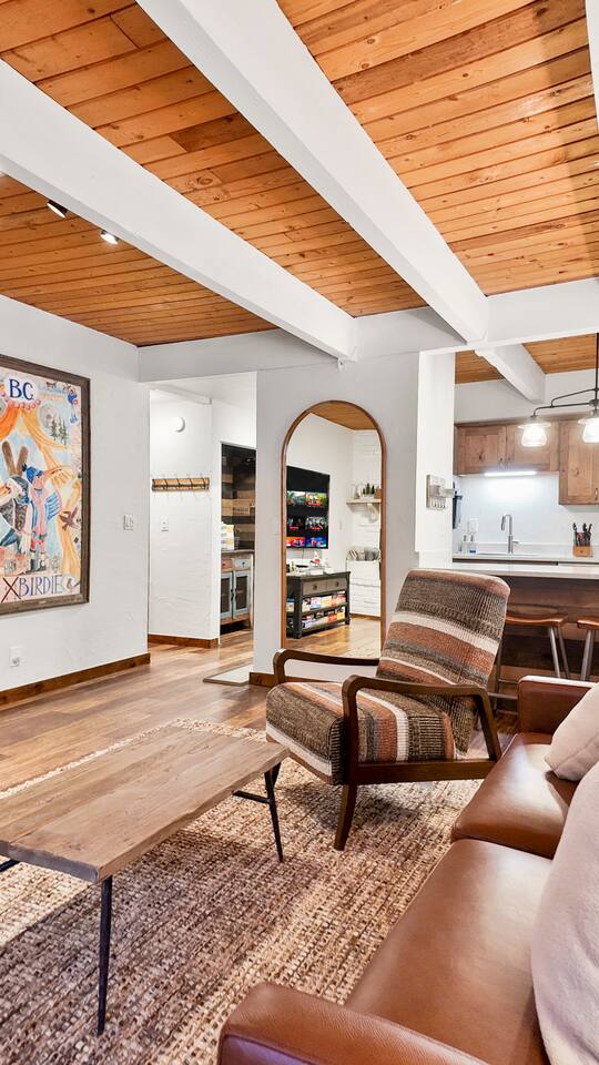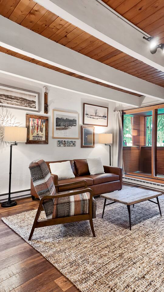 Step into a thoughtfully designed condo that blends rustic charm with modern convenience. The living area is warm and welcoming, featuring exposed wood beams, comfortable furnishings, and plenty of natural light. You'll have a fully equipped kitchen to prepare your meals and a cozy dining space to enjoy them. The living area invites you to unwind after a day of exploring, with a comfortable seating area, a flat-screen TV, and large windows that let in plenty of natural light. Property Highlights: - - - _