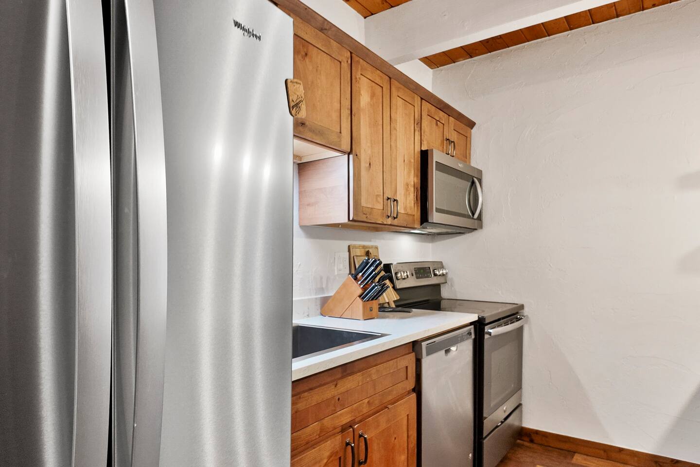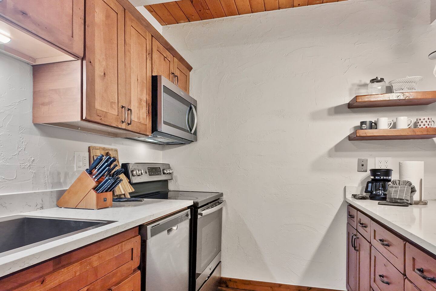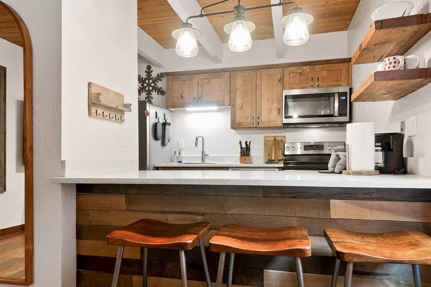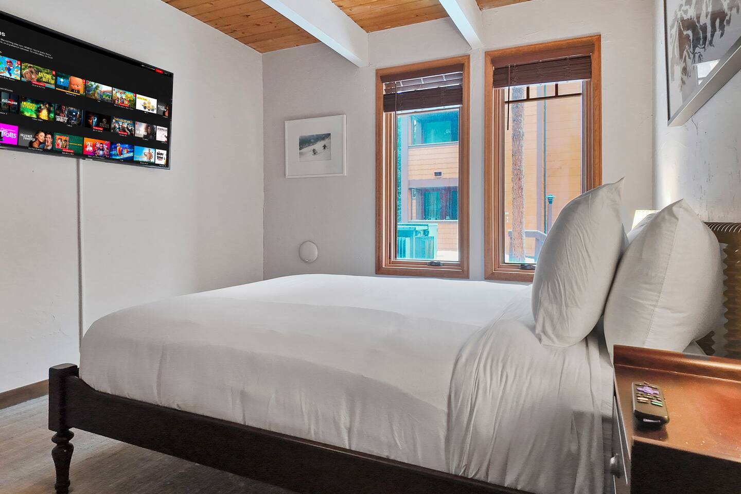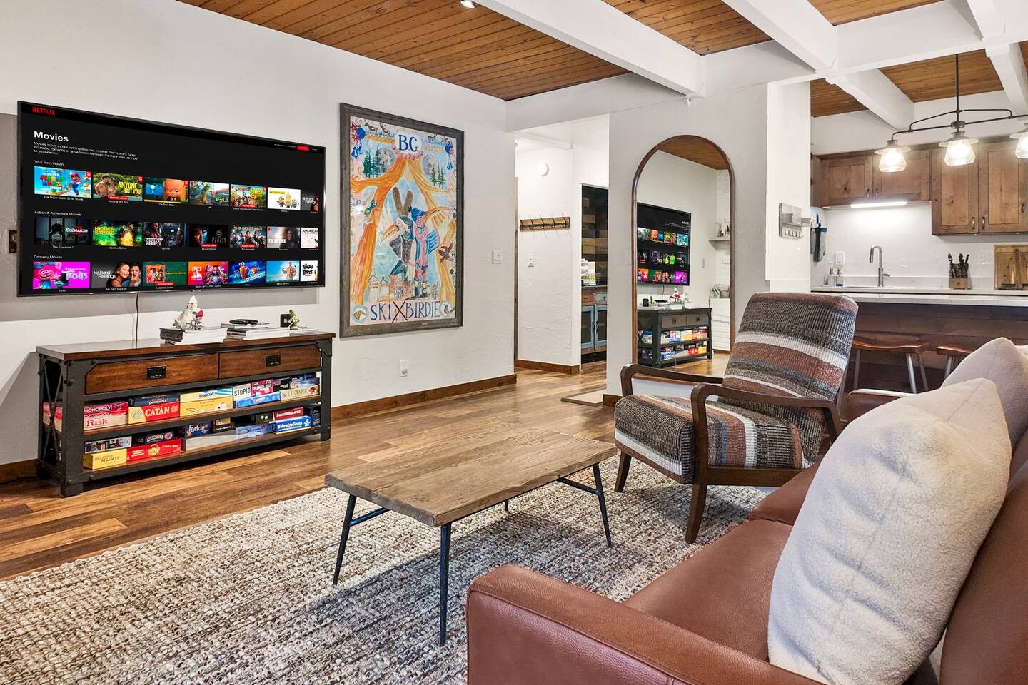 Step into a thoughtfully designed condo that blends rustic charm with modern convenience. The living area is warm and welcoming, featuring exposed wood beams, comfortable furnishings, and plenty of natural light. You'll have a fully equipped kitchen to prepare your meals and a cozy dining space to enjoy them. The living area invites you to unwind after a day of exploring, with a comfortable seating area, a flat-screen TV, and large windows that let in plenty of natural light. Property Highlights: - - - _